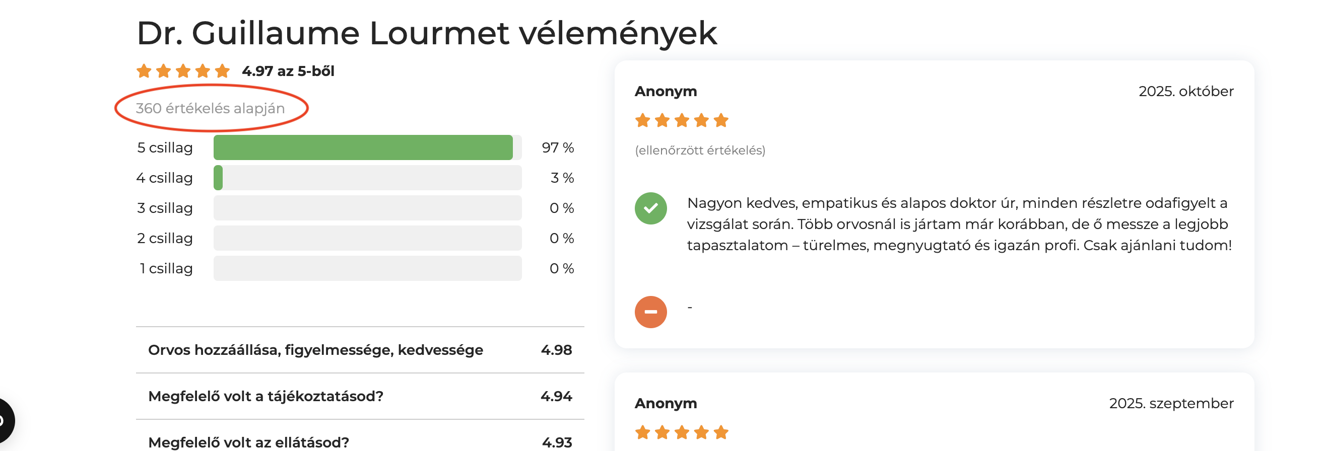 „Dr. Guillaume Lourmet rendelése számomra rendkívül pozitív tapasztalat volt. Barátsággal, kézfogással fogadott, minden kérdésemre válaszolt, a tüneteim alapján gyorsan diagnosztizált. A profi és emberséges orvosi hozzáállás iskolapéldája.”